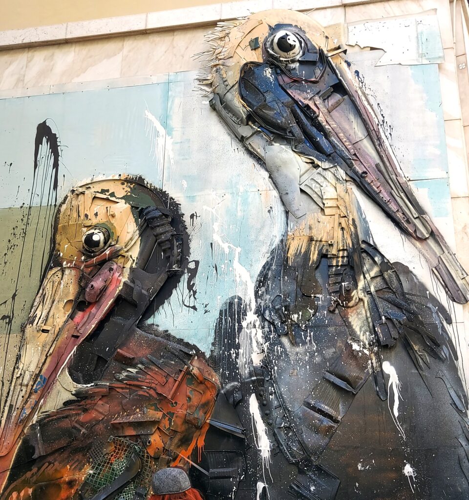 Two enormous pelicans rising from a wall, sculpted from scraps of metal, plastic fragments, broken bins, and forgotten urban debris. The kind of artwork that doesn’t just catch your eye — it grabs your attention and holds it. As a vegan, I’m always tuned into anything involving animals, but this mural felt different. It wasn’t just depicting animals; it was speaking for them.